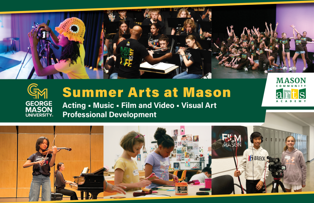 Join us this summer at George Mason University in Fairfax, Virginia for enriching and inclusive summer camps, programs and workshops focused on both artistry and skill-building in the areas of music, acting and theater, visual art, and film and video! Our robust schedule includes camps for ages 4–18 plus workshops for adults! A variety of weekly programs run from mid-June through mid-August.